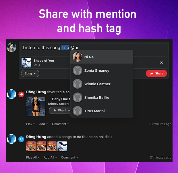 将歌曲/专辑/播放列表/艺术家分享给朋友,您可以提及您的朋友并在您的分享中使用哈希标签。
